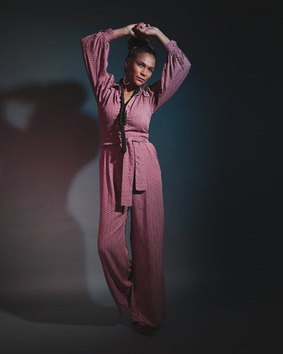 The Olmoti long sleeve printed jumpsuit is designed for ease, movement, and modern life. Cut with generous sleeves single button cuffs, a relaxed collar, an easy, fluid leg, and a self-fabric belt to shape the waist.